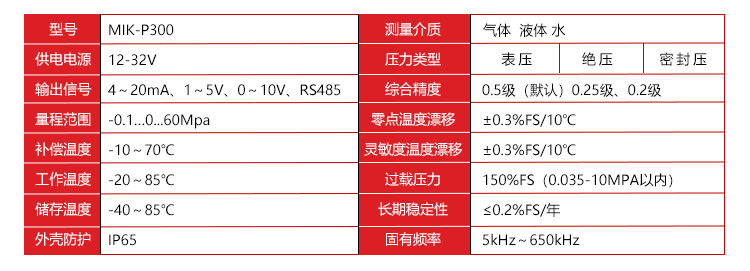 MIK-P300系列液位压力变送器压力敏感核心采用了高性能的硅压阻式压力充油芯体,内部的专用集成电路将传感器毫伏信号转换成标准电压